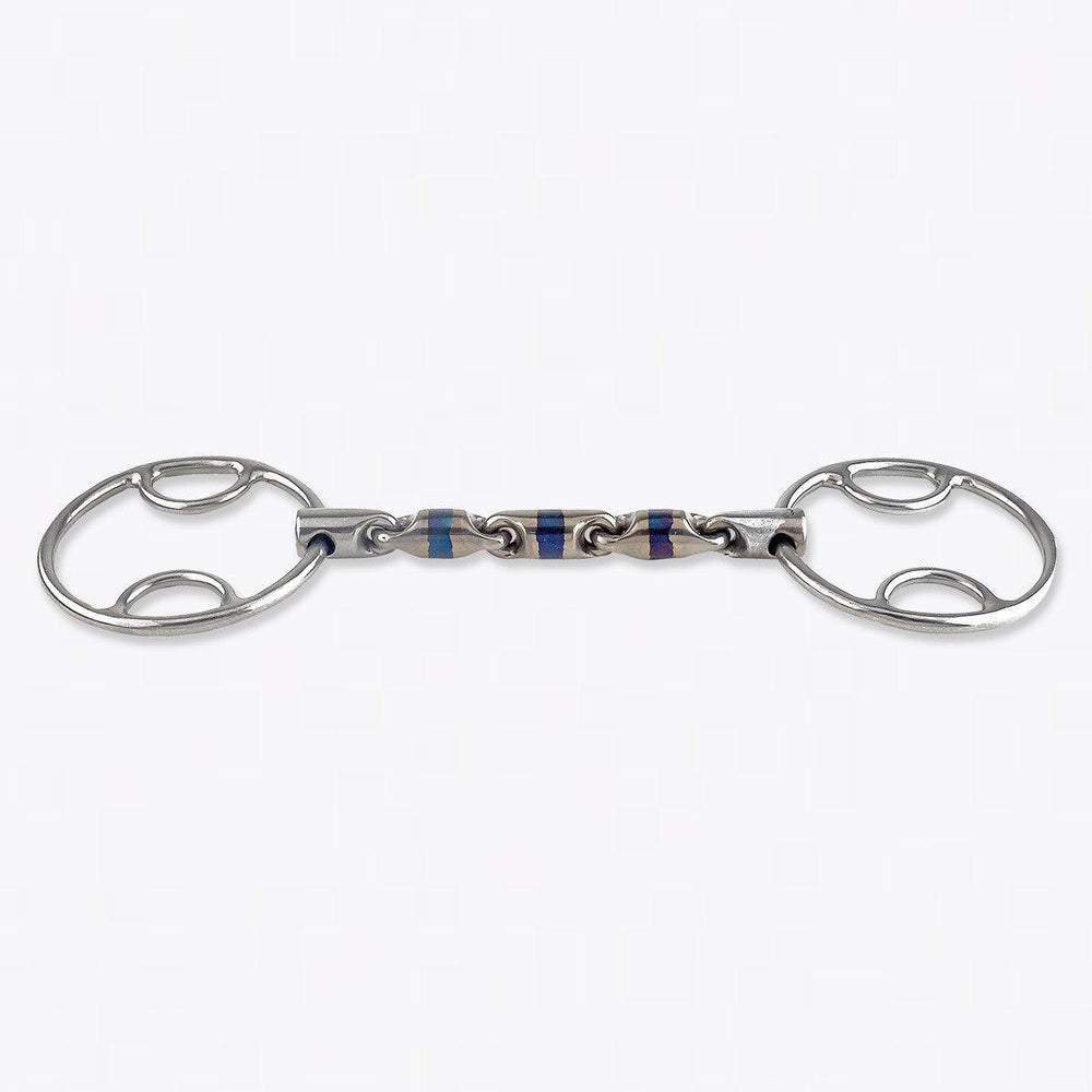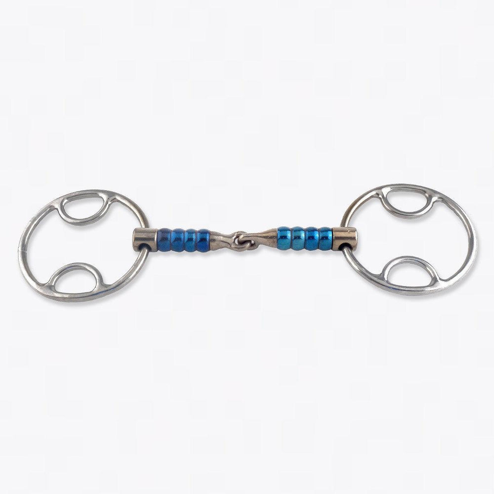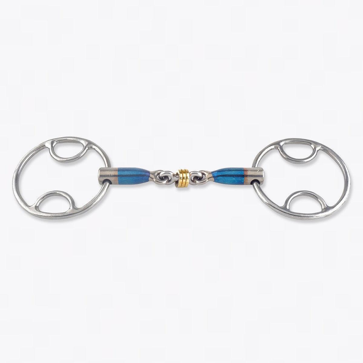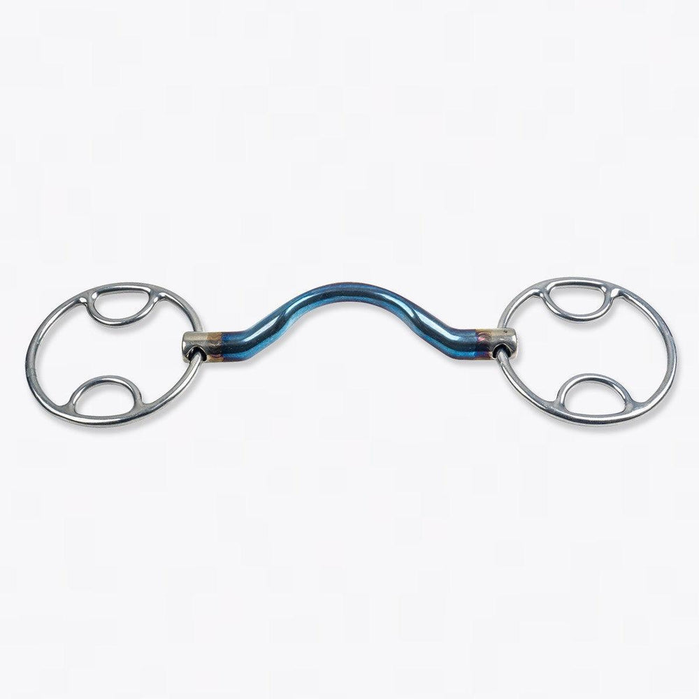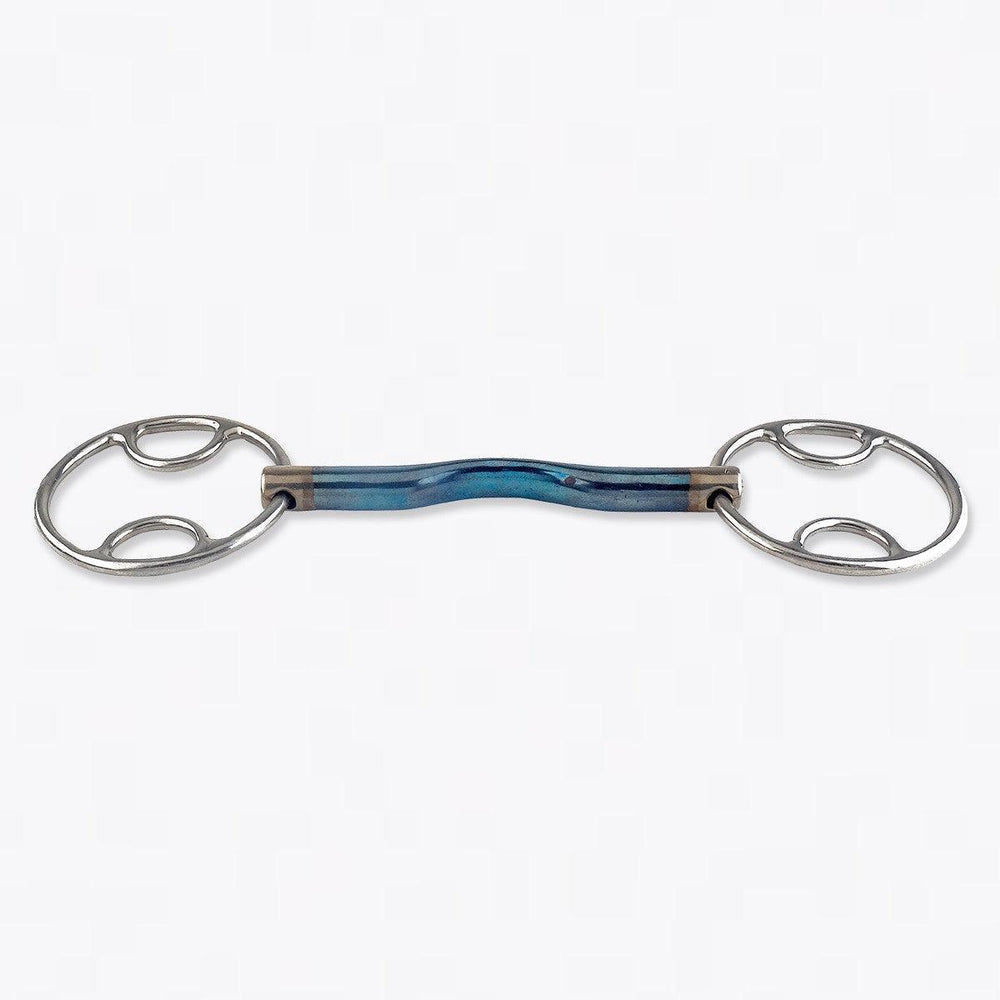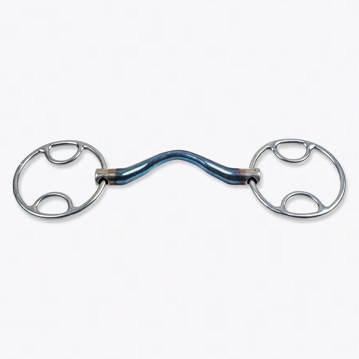 The Beval bit is an ordinary bit with extra eyes on the inside of the bit rings. This bit has a similar effect as a Pessoa bit and 3-ring bit but it works softer and has less leverage effect. The upper eye is used to attached the bit to the bridle. The bottom eye is for the reins.
