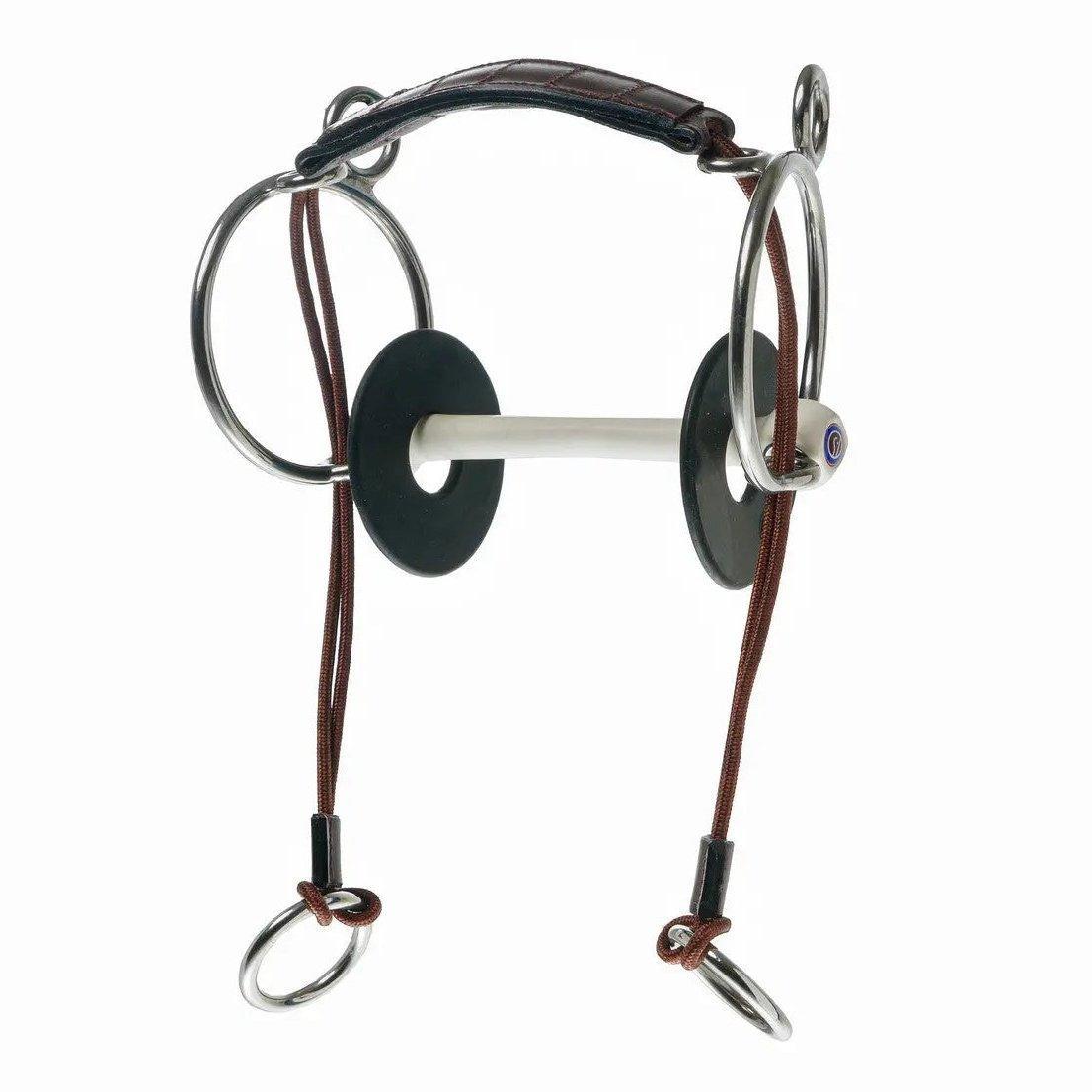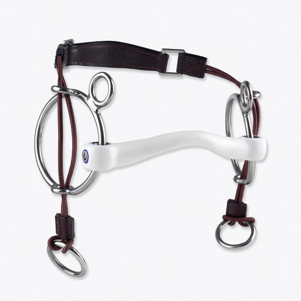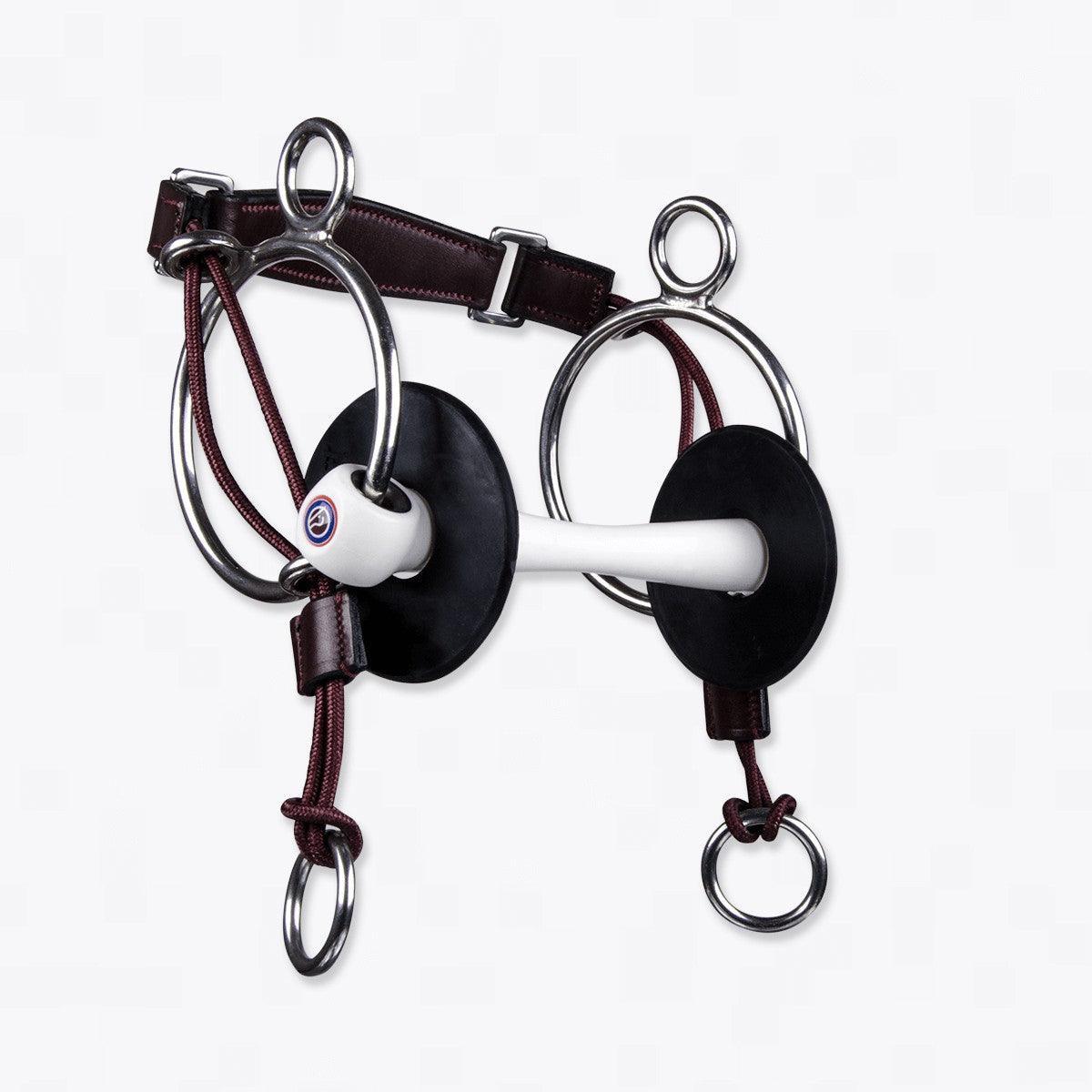 A curb gag is similar to a gag bit but has a different effect. The pressure isn't behind the ears but on the lower jaw. The string runs under the chin and the cheekpieces are attached to the extra ring at the top. This bit is effective for strong, hot horses and is mainly used by showjumpers. This bit is not suitable for inexperienced riders.