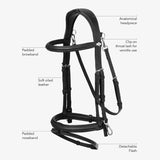 The clip on the cheekpieces allow the bit to be changed quickly and easily, along with the throat lash clipping onto D-rings on the headpiece making it fully detachable.