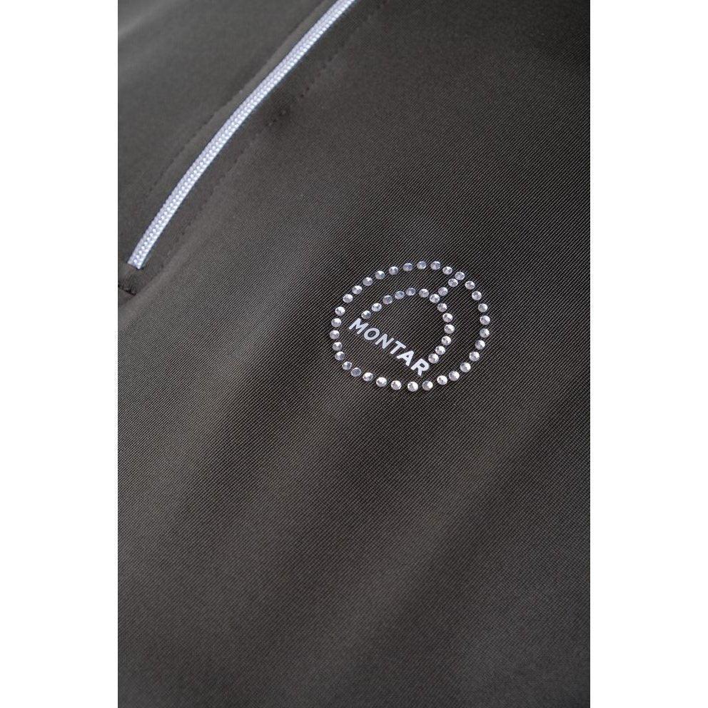 Everly Logo with a low stand up collar. In the front is a silver neck zipper and on the left side of the chest is a Montar logo in clear crystals. The perfect polo for your classic equestrian wardrobe. The highly functional Mon-tech fabric is breathable and sweat absorbent, which ensures a comfortable feeling even when you work hard riding your horse.