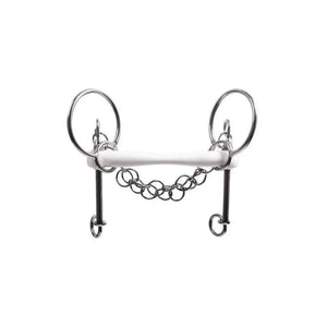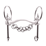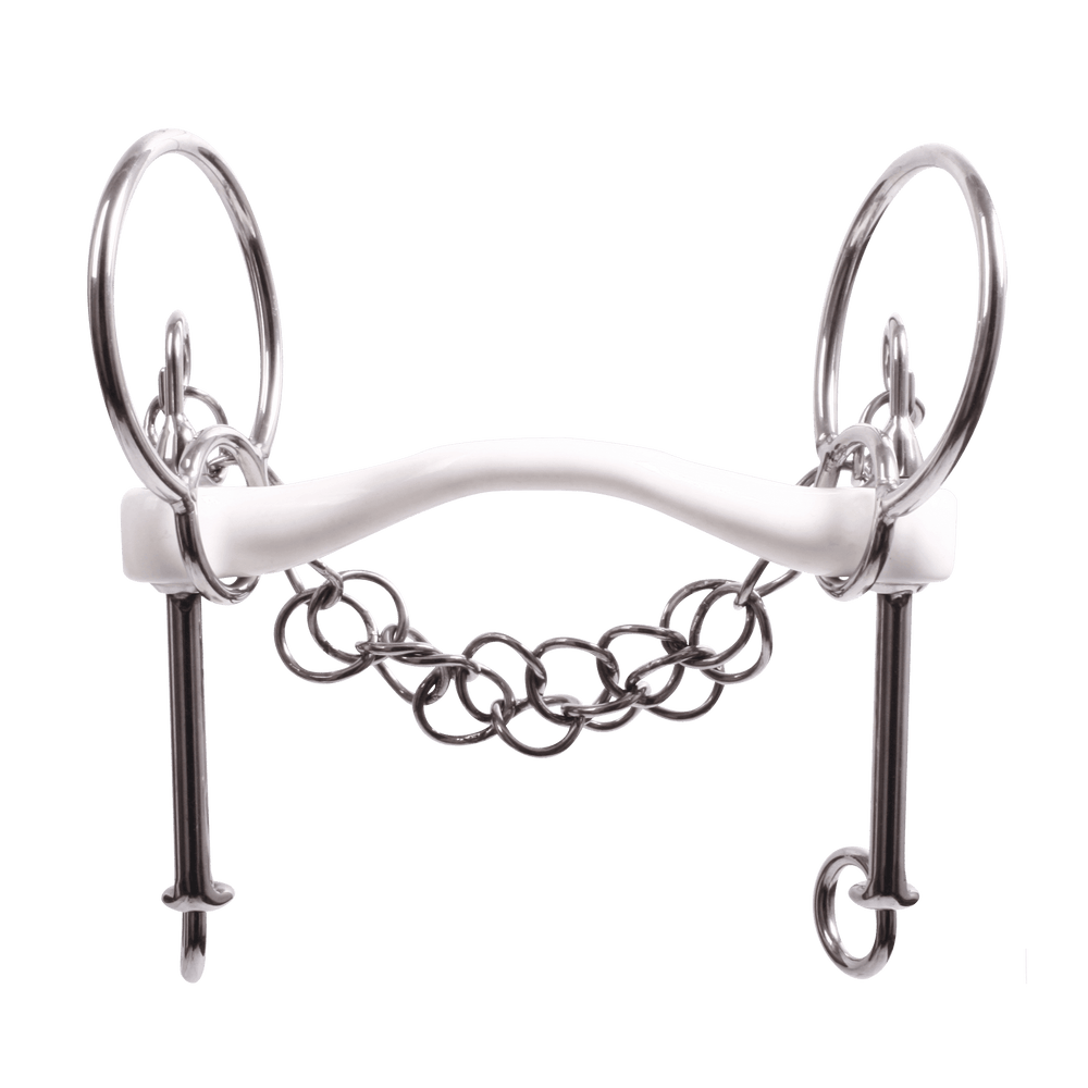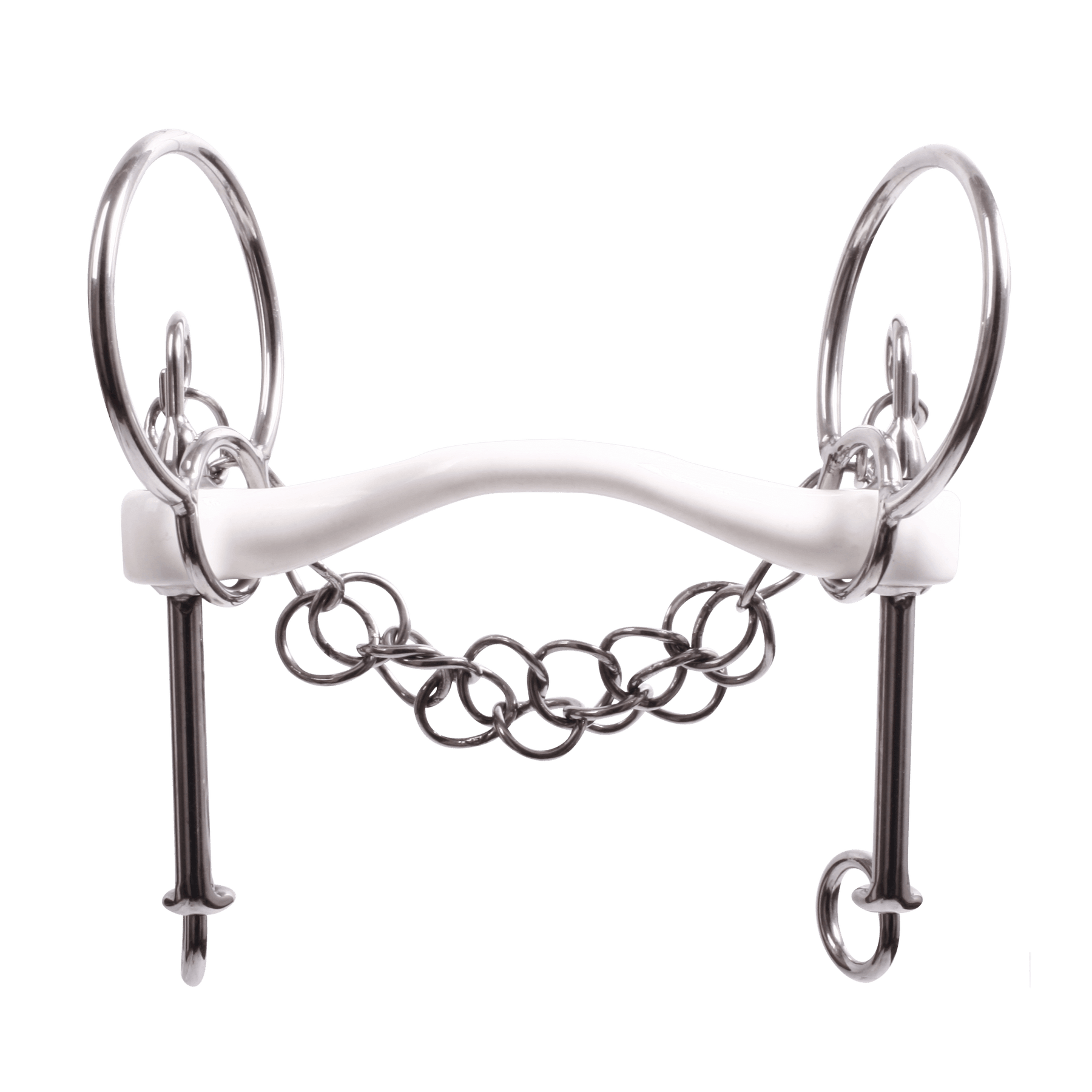 The swales has the effect of a double bridle, but is less complicated. You can ride with 2 reins, one on the normal ring for a soft contact and the other on the lower ring for the effect of the weymouth. The Swales has separate rings for attaching the cheekpieces so that the effect of the rein only affects the lower jaw. The baby swales has short shanks and therefore is a milder bit than the normal swales.